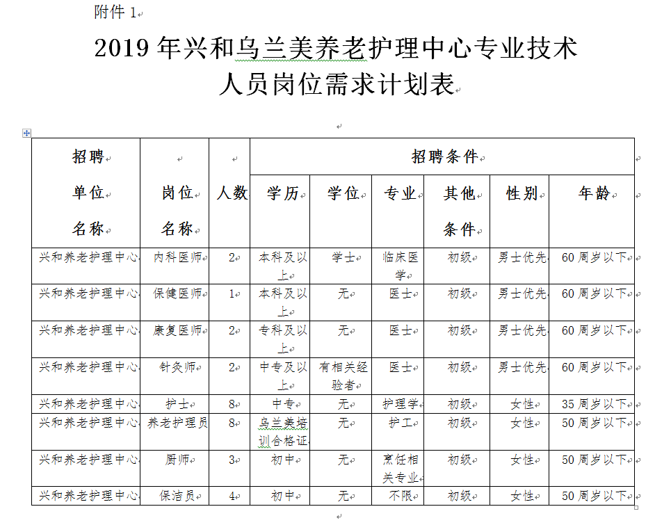 5.戶籍要求截止到2018年11月30日前為烏蘭察布市戶籍。(詳見附件1:2019年興和烏蘭美養(yǎng)老護(hù)理中心專業(yè)技術(shù)人員崗位需求計(jì)劃表)。