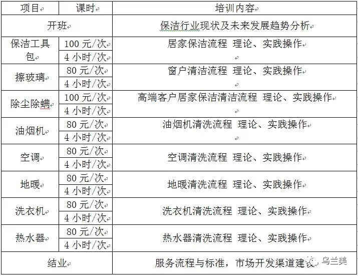 根據(jù)目前家政保潔市場(chǎng)需求及社會(huì)人員就業(yè)需要,經(jīng)公司研究決定,烏蘭美將推出家電清洗保潔培訓(xùn)班。通過家電清洗保潔培訓(xùn)班提高從業(yè)人員行業(yè)的操作專業(yè)水準(zhǔn),更好的為我市市民提供優(yōu)質(zhì)的服務(wù)。